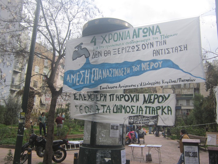 Στις 17 Αυγούστου του 2011, μέσα στο κατακαλόκαιρο, ο νυν δήμαρχος Καμίνης, συνεχίζοντας με συνέπεια το έργο του προκατόχου του, προχωρεί στη διακοπή της υδροδότησης του πάρκου, με τη συνδρομή των δυνάμεων καταστολής, προκειμένου να οδηγήσει στην ερήμωσή του και στην κάμψη του κοινωνικού αγώνα που εκδηλώνεται εδώ.
